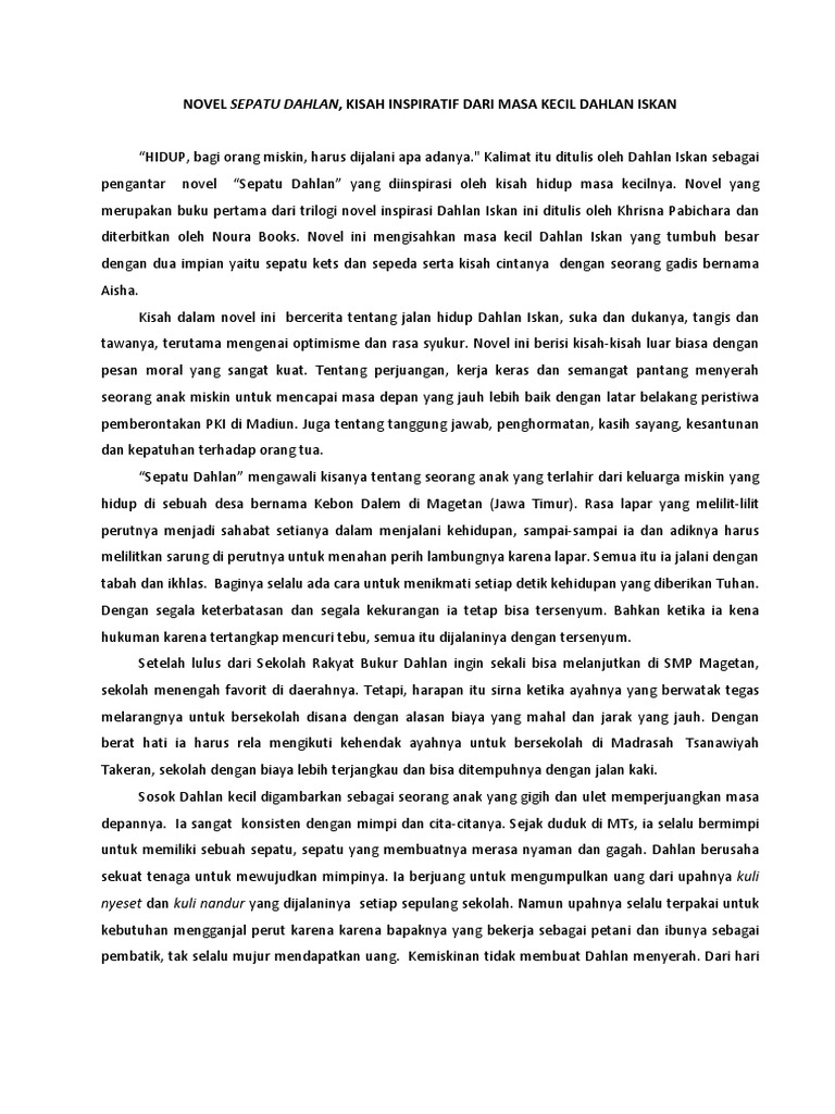 Sepatu dahlan sendiri adalah rangkaian. Melalui novel ini terungkap bahwa dahlan iskan dibesarkan dalam keluarga miskin di desa kebon dalem magetan jawa tengah yang harus berjuang guna memenuhi kebutuhan dasar hidupnya. Atmaja kania loliek 2013.