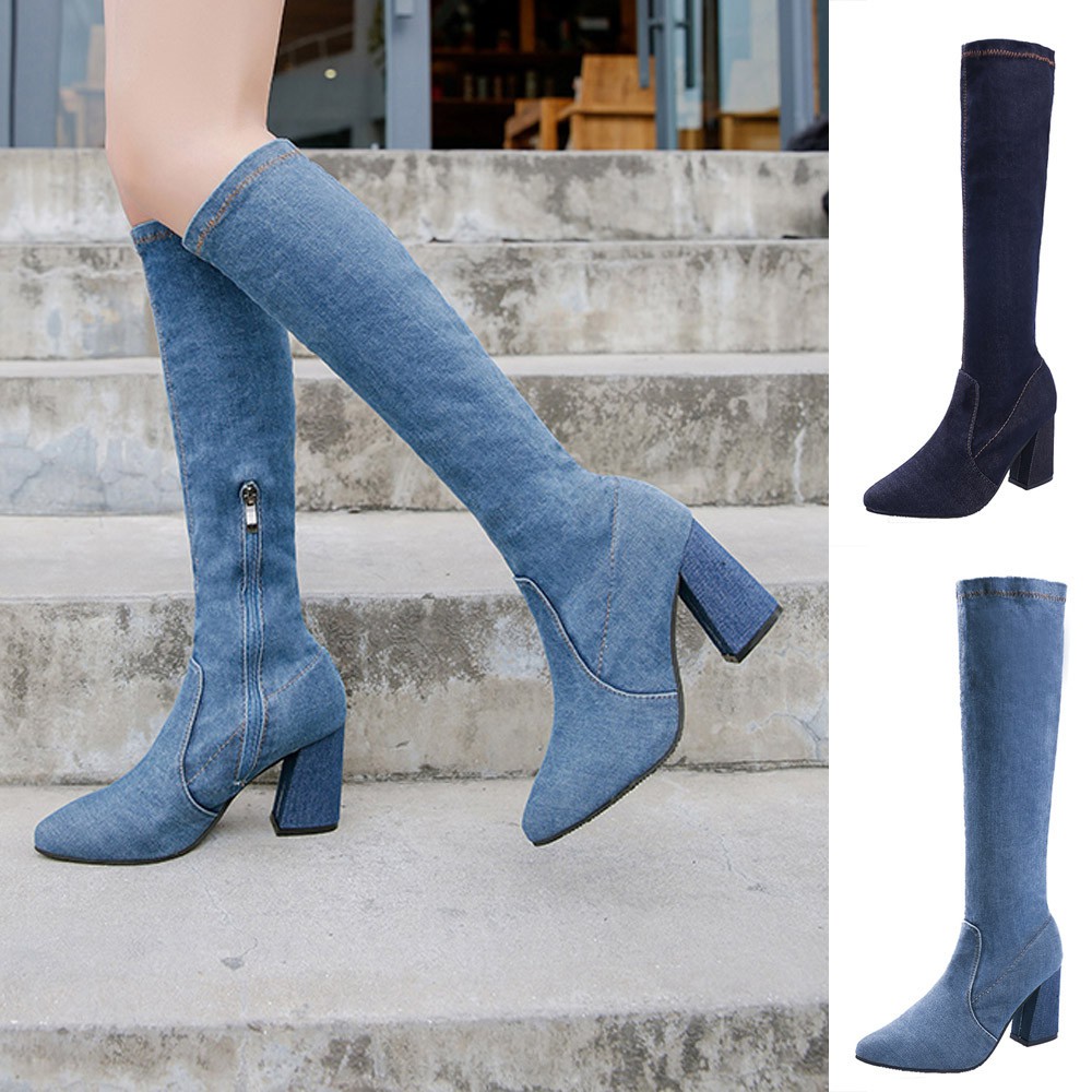 Sepatu Boots Sebetis Wanita Bahan Denim Hangat Dengan Resleting