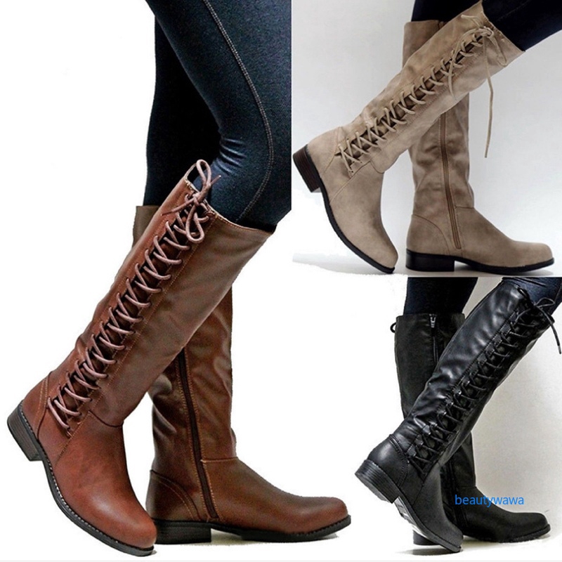 Wa Sepatu Boots Selutut Bahan Kulit Pu Aksen Lace Up Gaya Vintage