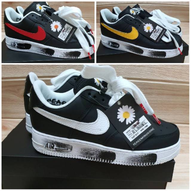 Dikeluarkan dengan dua warna merah dan hitam sepatu edisi kolaborasi nike dengan peaceminusone air force 1 para noise ini dijual dengan harga 219 ribu korea won 187 dollar as atau setara dengan rp 2 6 juta. Selain itu sepatu peaceminusone memiliki logo unik berupa gambar bunga yang merupakan kesukaan g dragon. Logo swoosh atau gambar contreng khas nike di sepatu ini menggunakan dua warna hitam dan merah.