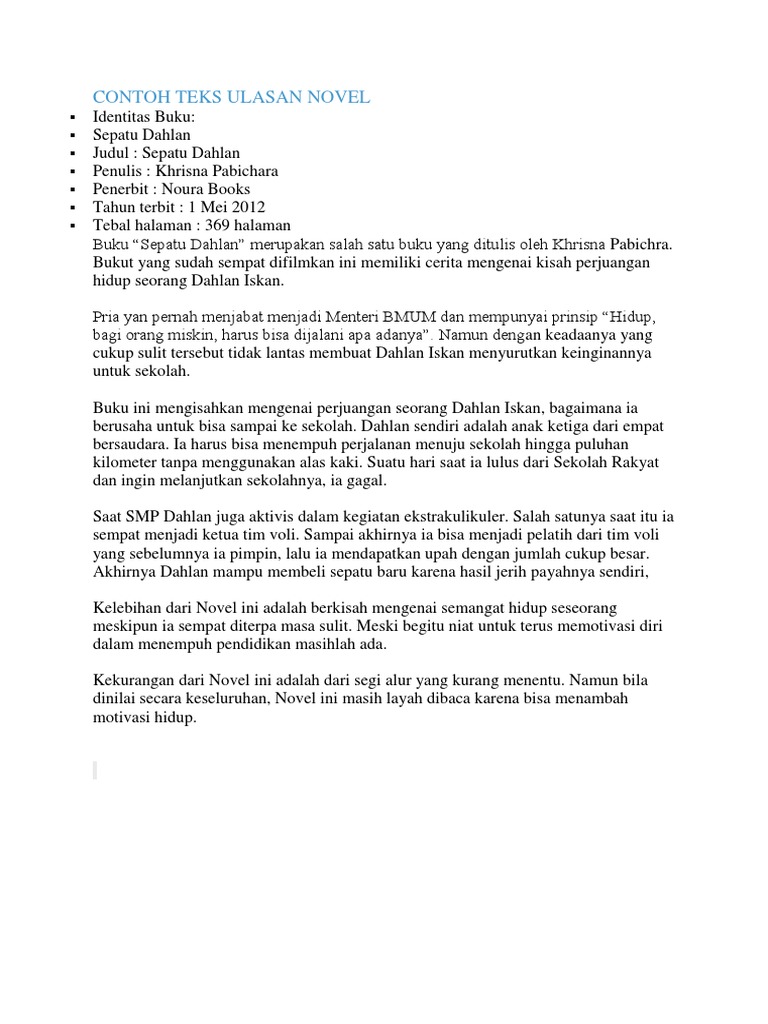 Novel sepatu dahlan yang merupakan bagian pertama dari trilogi novel inspirasi dahlan iskan ini mengisahkan kehidupan dahlan iskan saat remaja. Memuat informasi berdasarkan pandangan atau opini penulis terhadap suatu karya atau produk. 8 contoh teks ulasan buku sepatu dahlan.